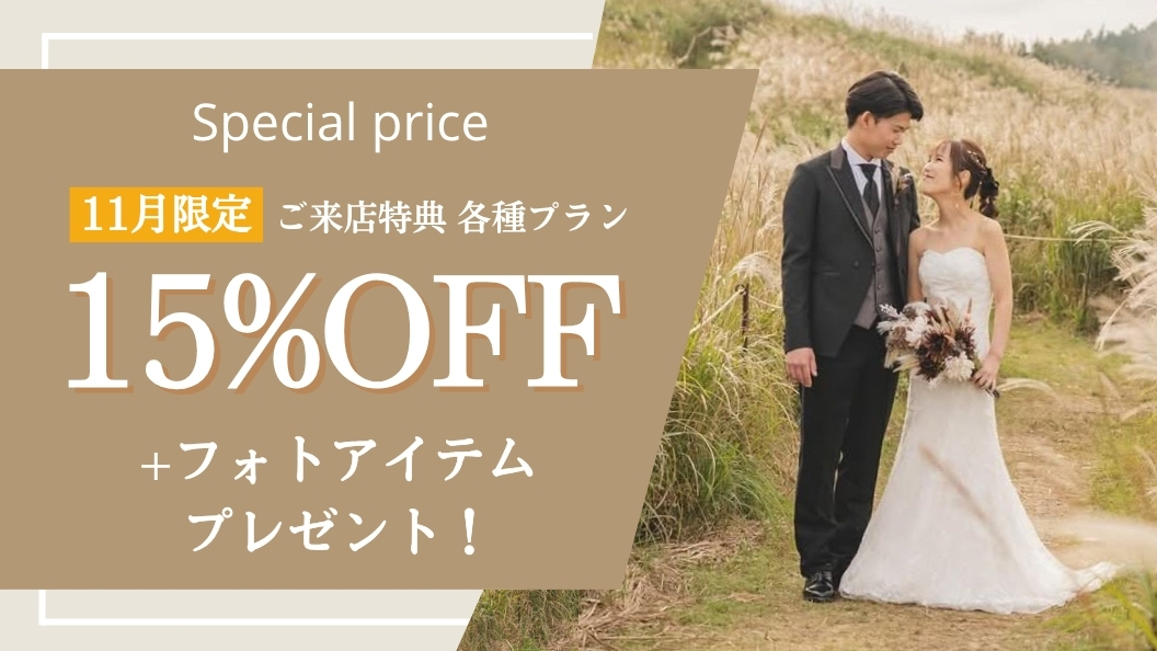 11月中にご来店いただいたお客様限定で、撮影全データ込みの洋装1点スタジオプランがほぼ半額の55,000円に!